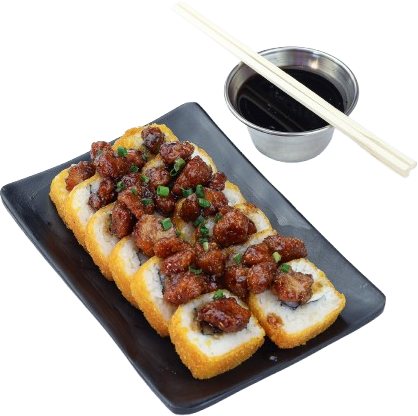 Favorito! Delicioso sushi empanizado con filadelfia y coronado con pollo agridulce